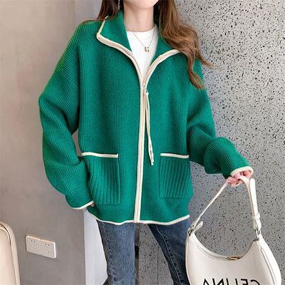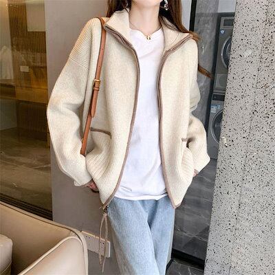 カーディガン レディース 秋冬 厚手 長袖 配色カーディガン ハイネック ニット ドロップショルダー 羽織り アウター 前開き ショート丈 ゆったり 肩落ち トップス おしゃれ カジュアル かわいい
