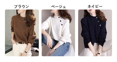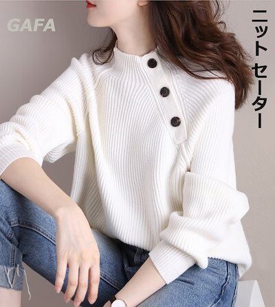 ニット セーター レディース バルーンスリーブ 長袖 ハイネック トップス 斜めボタン リブニット 無地 春秋 ファッション 通勤 オフィス 大人 おしゃれ シンプル