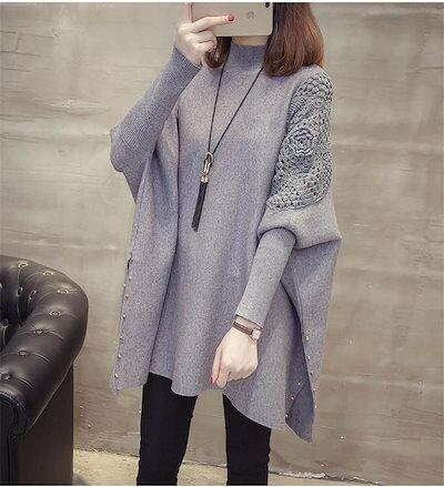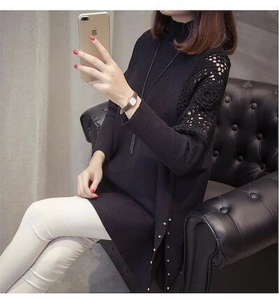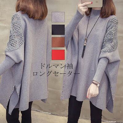 【人気】ニット セーター 長袖 ロング丈 ドルマンスリーブ レディース ハイネック ニットセーター 透かし彫り アウター サイドスリット お洒落 ゆったり ドルマン袖 体型カバー お洒落 ニットソー