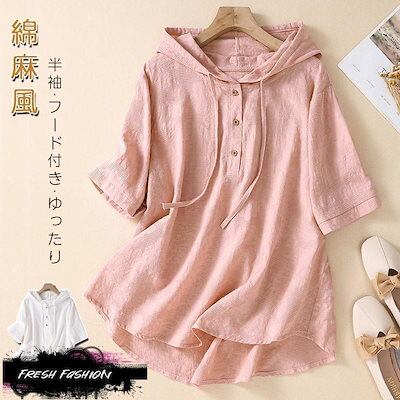 パーカー Tシャツ レディース ブラウス 春 夏 秋 リネン フード付き チュニック 半袖 シャツブラウス 綿麻 トップス プルオーバー ゆったり