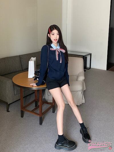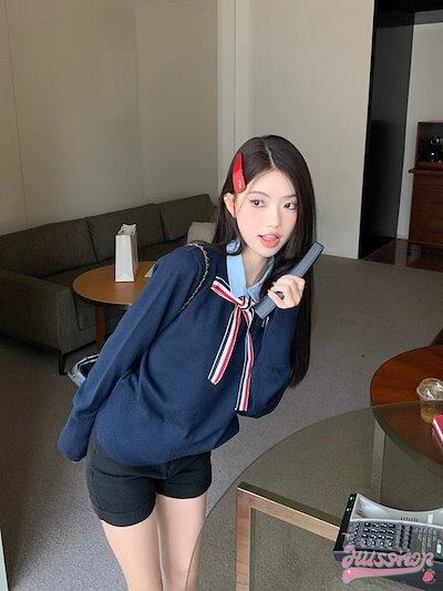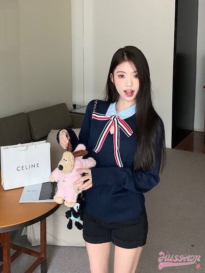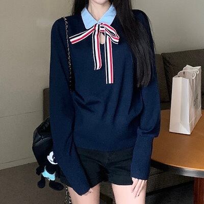 トップス ニット セーター リボン 長袖 襟 スリム 細見え 春 紺 ネイビー かわいい おしゃれ 韓国ファッション レディース お出かけ