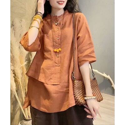 今っぽシアーシャツ レトロ綿麻シャツ夏らしいデザイン感七分袖ゆったりスリムトップスシャツ 半袖 レディース ブラウス トップス シースルートップス