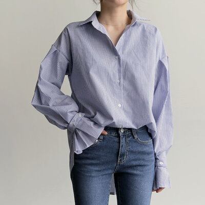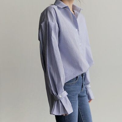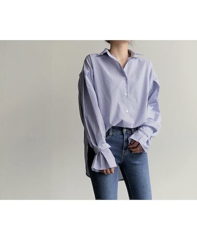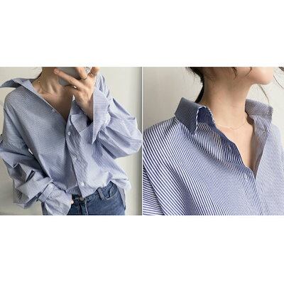 レディース シャツ シアーシャツ 新作 韓国ファション 学生 通勤 ゆったり 百掛け スリム見え 長袖 ブルー ホワイト ストライプ柄 スリム見え フレアスリーブ