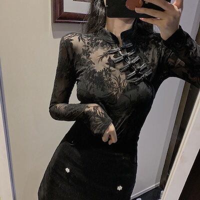 レディース ブラック セクシー シースルー レース シャツ チャイナ風 デザインセンス スリム ギャル ブラウス