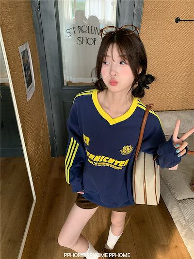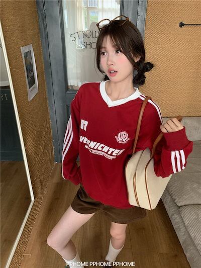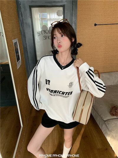 2024 秋冬 トレンド トップスバイカラー長袖 かわいいK-POPTロング_白レディース韓国風ロゴ衣装ルーズゆったりカジュアルおしゃれサイズスリーブシルエットファッション系サイドシャツフット春