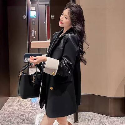 アウター レトロ パッチワーク ブラック レザージャケット レディース 春と秋 上級 アウターウェア 今年人気 シック トップス スタイリッシュ 韓国