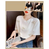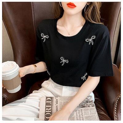 Tシャツ レディース 40代 春夏新作 オシャレブラウス 白Tシャツ 半袖トップス リボンラインストーンTブラウス 大人 通勤 ゆったりTシャツ 韓国風 30代 50代