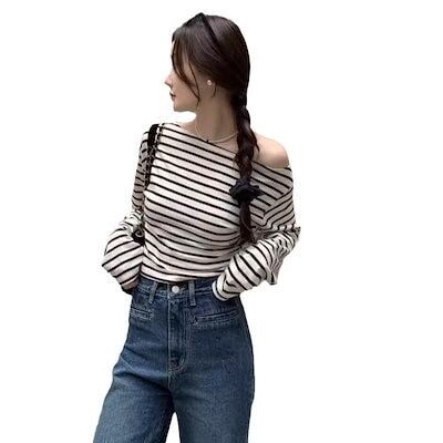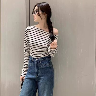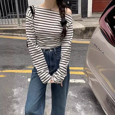 韓国シック2024春新作韓国風シンプルストライプオフショルダー長袖tシャツレディーススリムで万能トップス