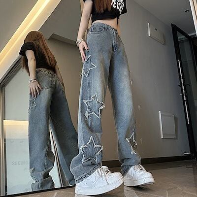 デニムパンツ ブルー スター 刺繍 ジーンズ レディース 春秋新作 デザイン ルーズ ストレート ワイドパンツ ファッション 韓国