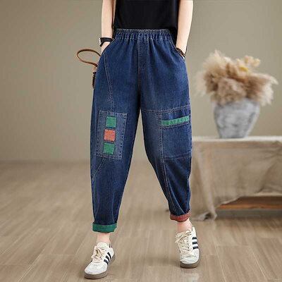 「ファットガール」 夏 刺繍 デーパードパンツ デニムパンツ ジーンズ ゴム 薄手 体型カバー 大きいサイズ ゆったり レディース