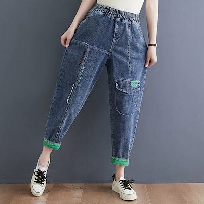大きいサイズレディースジーンズ九分丈 ハイウエストデニムロングパンツ可愛い刺繍大きなポケット韓国ファッションカジュアル春服