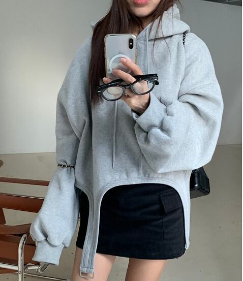スウェット トレーナー アシンメトリー 長袖 切り替え 体型カバー 着痩せ 帽子付き シンプル カジュアル パーカー カットソー 不規則 フード付
