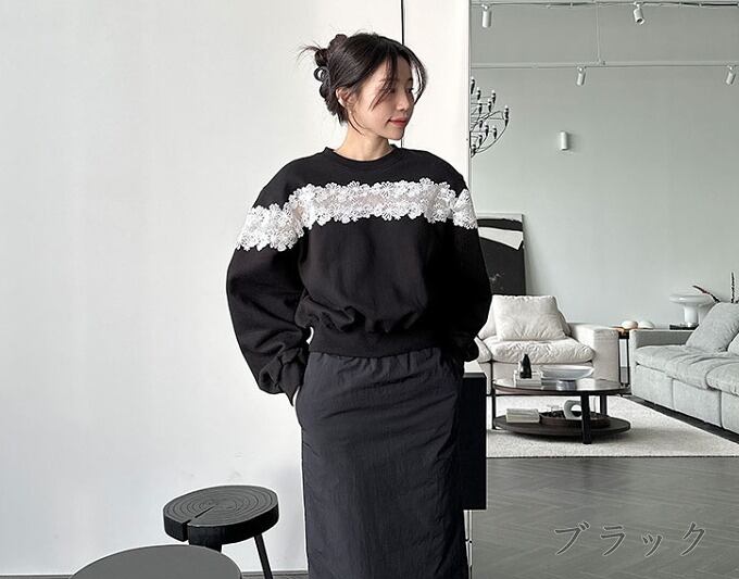 全2色 スウェット トレーナー 長袖 切り替え 体型カバー 着痩せ レース シンプル