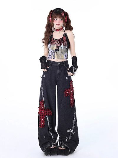 激?れ人気商品 脚長効果!デニムパンツ かっこいい!スラックスパンツ ストレートジーンズ 春夏アメリカ パンク 刺繍 ゆったり ワイドパンツ