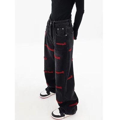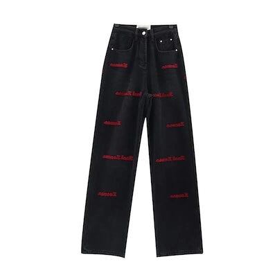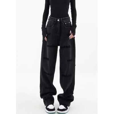 黒 刺繍 ジーンズ レディース 春秋 デブお姉さん 大きいサイズ アメリカンレトロパンツ ハイウエスト スリムストレート ワイドレッグパンツ