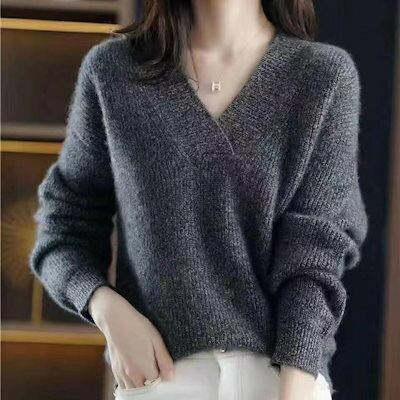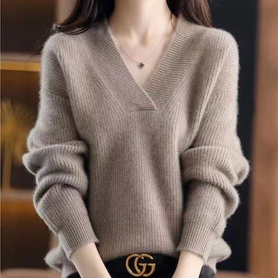 リブニット Vネックジャンパー女性秋冬新作無地シンプルファッションレディースニットトップス