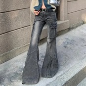 女性の個性的なポケットデザインバギーカーゴパンツ、アメリカのローウエストのワークウェア、ヴィンテージウェア、ゆったりとしたアーティスト、ストレートレッグ、flared y2k ボトムス T240901121327_01